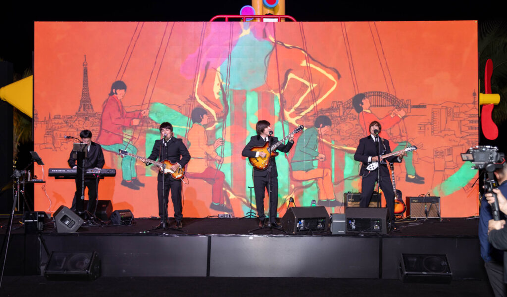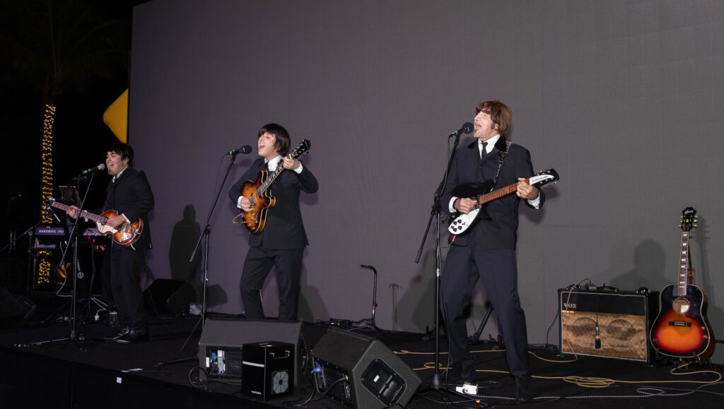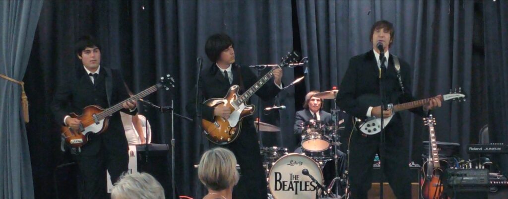 Musical-theatrical Beatles/Lennon Tribute band DRIVE MY CAR recreates the optimism of the 1960s+ with sound-alike Beatles vocals, lookalike visuals, virtuosic solos, authentic costumes, humourous banter, and the potential for partial-to-full theatrical performance, as desired. These musicians, of the highest caliber and uniquely theatrical, perform songs most tribute bands cannot touch. “Paul” looks and sounds like the real McCartney – showing his phenomenal bass playing. “George” wins over the girls – not only with his sweet smile and Harrison voice, but also with his unprecedented lead guitar solos. Top casting agents and directors in the US and Europe say that frontman Lenn Johnston resembles John Lennon in looks, voice, and spirit more than anyone in the world – he adds a cheerful harmonica to his expressive vocals, rhythm guitar, keyboards and clever Lennonesque banter. With a fifth man – a classical/jazz keyboardist as “George Martin” and “Billy Preston” – DRIVE MY CAR plays solos for “In My Life”, “Don’t Let Me Down”, and many more, including the orchestral parts of later songs. You will feel as if you were at an actual Beatles concert – even peeking backstage with the Beatles and watching them time-travel to today! Perfect for theaters, weddings, corporate, and other special events!